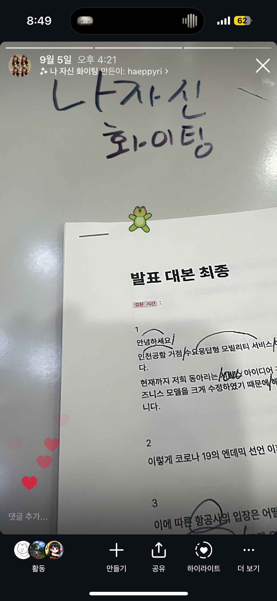 역시 발표할 땐 대본은 참고할 용도로만!!!!!!!!!!! ppt화면 보면서 자연스럽게 나올 수 있도록 연습하쟈 ㅎ_ㅎ